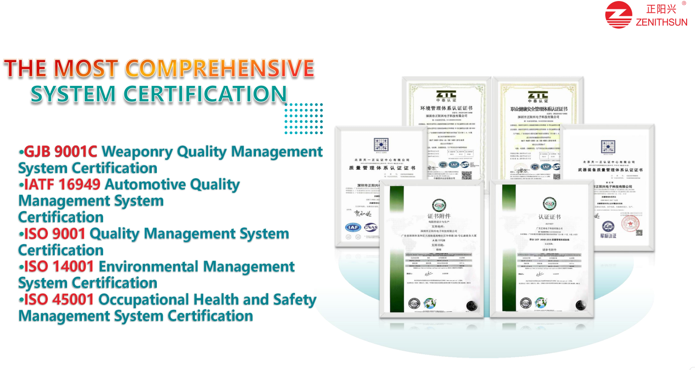 - Authoritative Certifications: Holding GJB 9001C (Weaponry Quality Management System), IATF 16949 (Automotive Quality Management System), and ISO 9001/14001/45001 certifications, ZENITHSUN’s products meet global quality and safety standards.